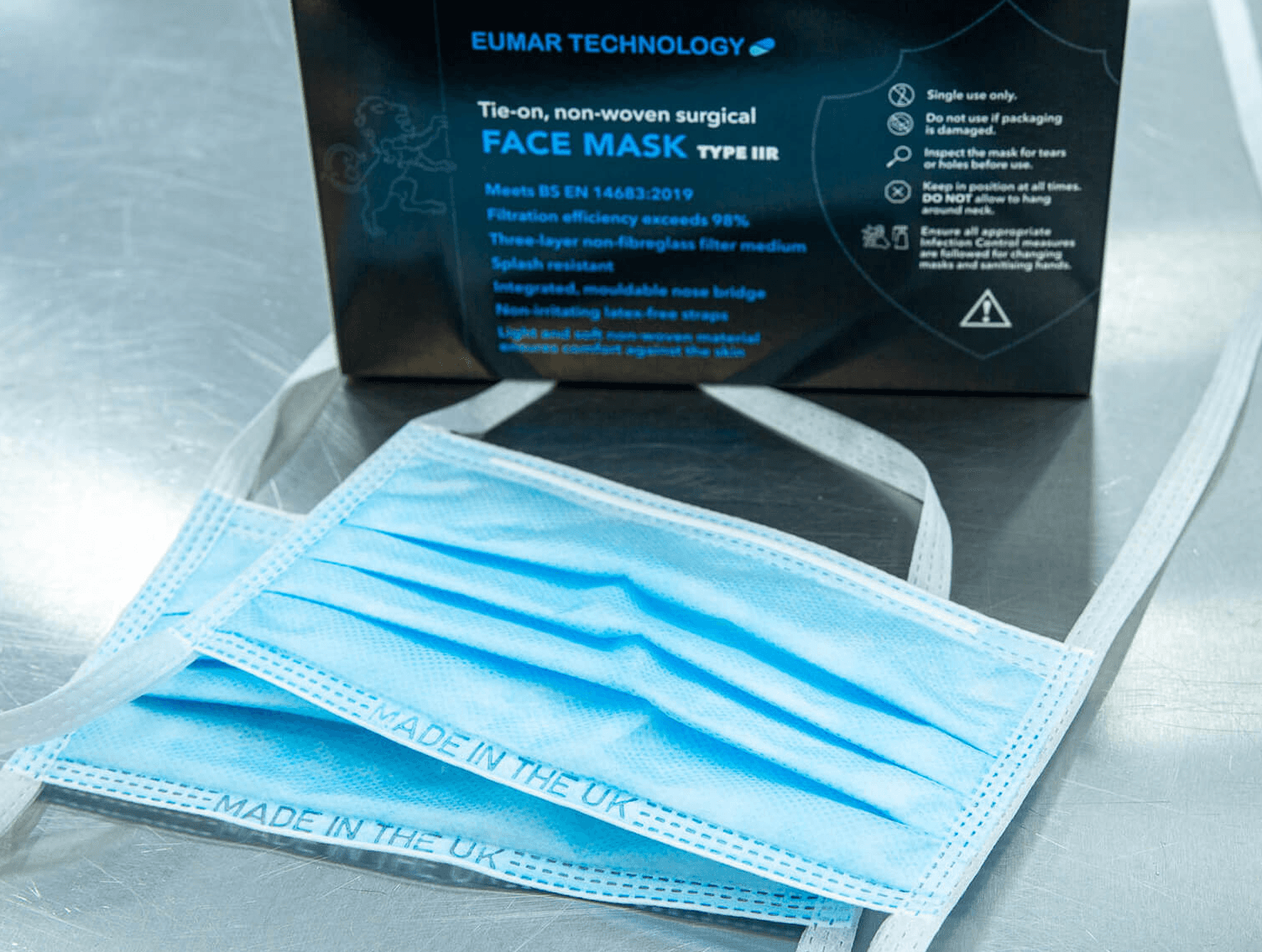 We built the fastest manufacturing process in the world for Type IIR facemasks having been approached by the UK Government to supply medical masks during the pandemic response. We can produce up to 20 million ear loop facemasks a month with high-speed tailored packing and labelling lines. We can also supply Type IIR tie back masks.